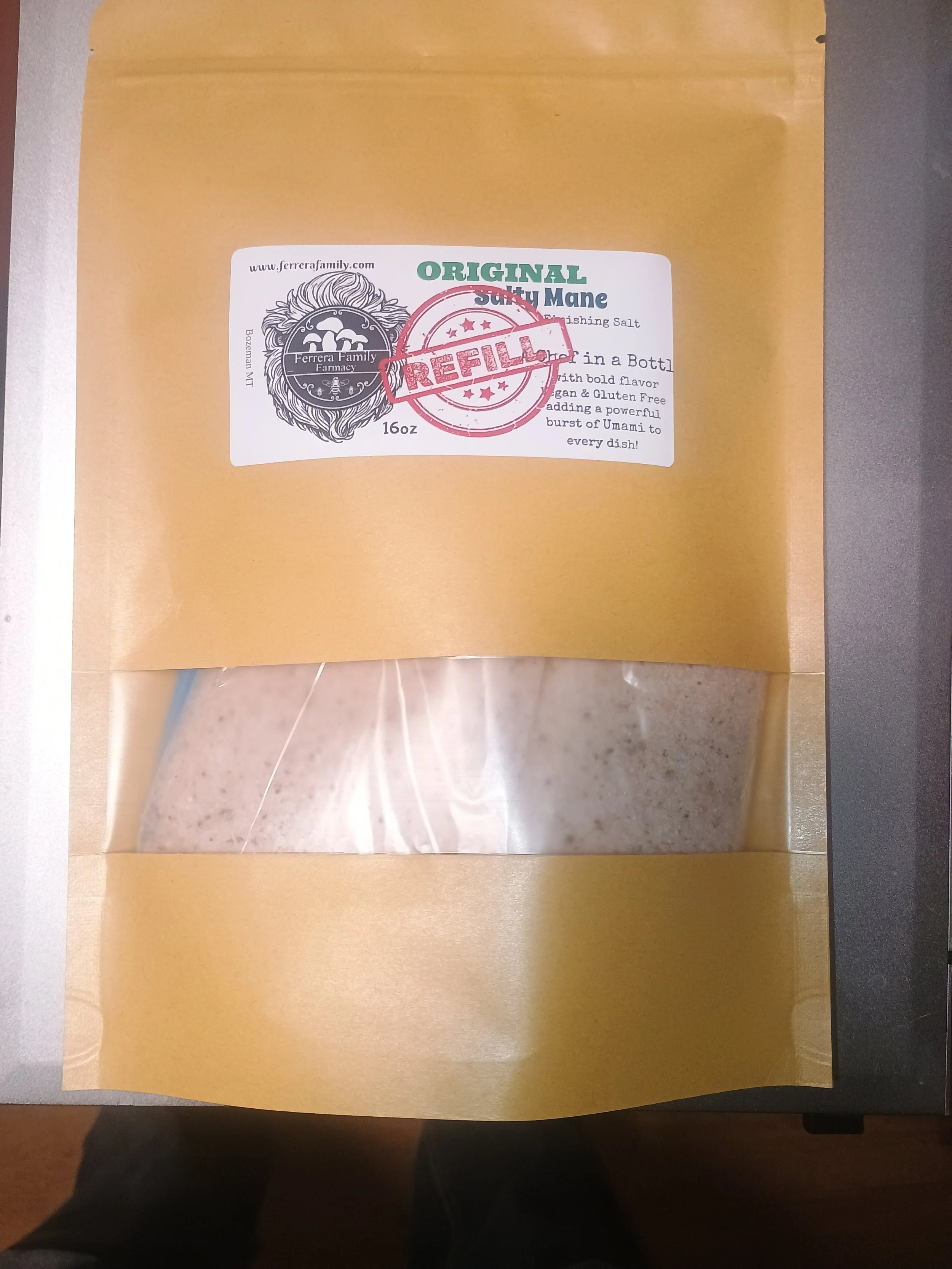 Shop › salty mane original Refill Image 1 of 1 salty mane original Refill $75.00 Enjoy a 16 oz bag of salty Mane to refill your salt shaker or fill your own salt shaker. Purchase Added! Enjoy a 16 oz bag of salty Mane to refill your salt shaker or fill your own salt shaker.